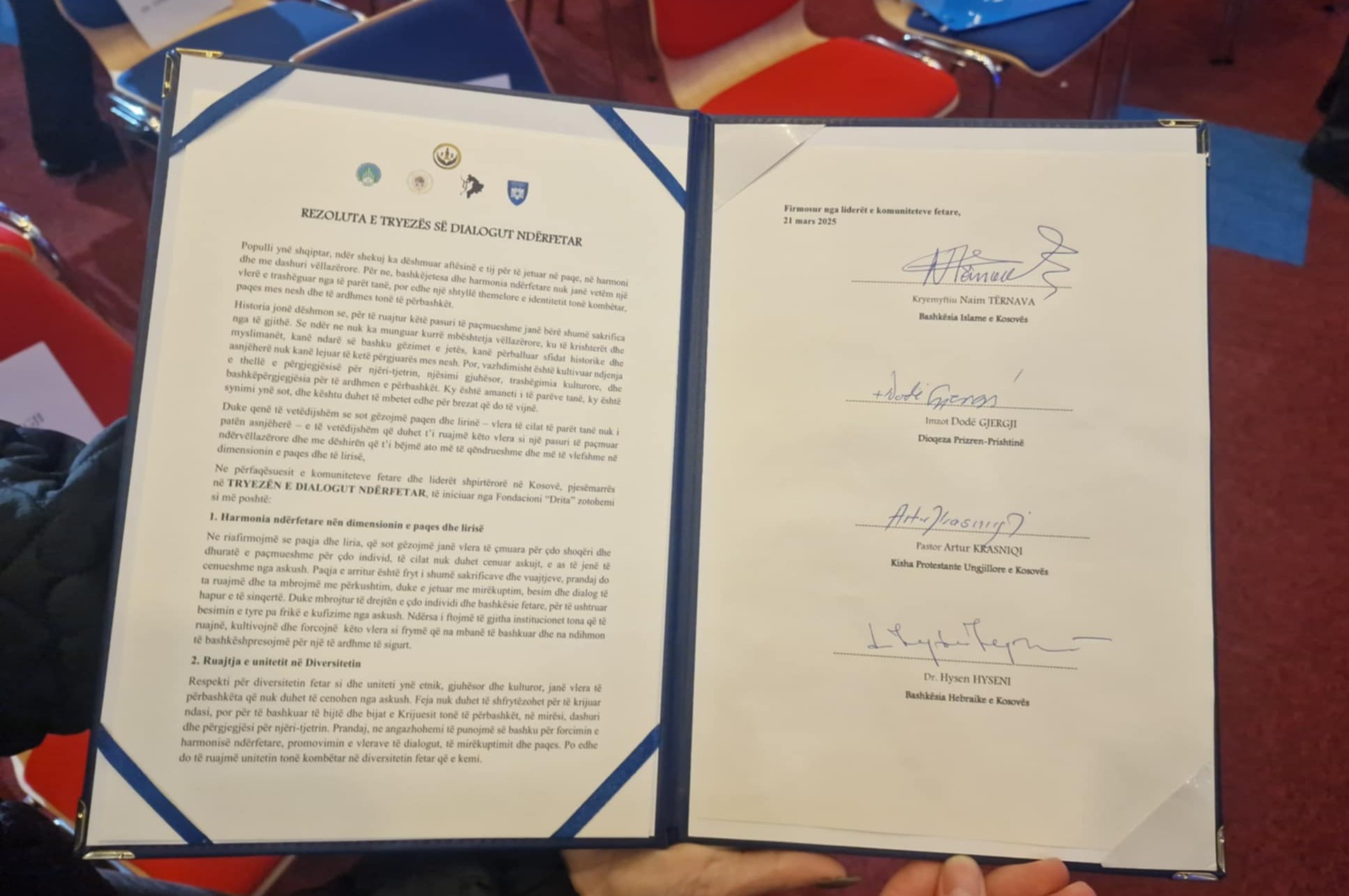 Ne përfaqësuesit e komuniteteve fetare dhe liderët shpirtërorë në Kosovë, pjesëmarrës në TRYEZËN E DIALOGUT NDËRFETAR, të iniciuar nga Fondacioni “Drita” zotohemi si më poshtë: